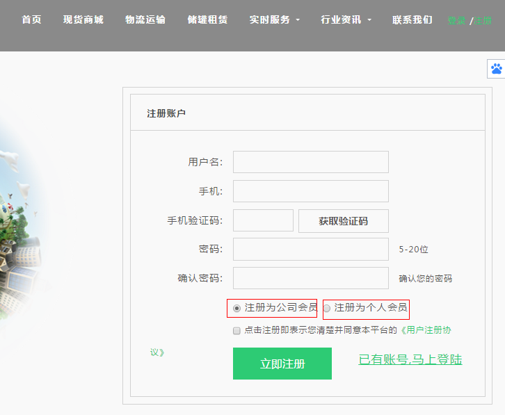 备注:1. 可选择注册为(公司会员,个人会员)